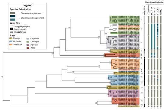For further interpretation of phylogenetic relationships and geographical distribution of genetic clusters, a conservative number of putative species (17) will be considered the most reasonable hypothesis (Figure 4). This hypothesis was based in part on the statistical support for each lineage in the phylogenetic inferences and the distribution of haplotypes in the TCS network analysis. We also assume that some splits observed in bPTP and STACEY multilocus analyses probably represent intraspecific variation; for example, for clade 11 from Mojanda (bPTP) and clade 3 from Cayambe (STACEY). This suggestion is based on the low number of mutations among these haplotypes in TCS analyses. This number of presumed species also corresponds well with preliminary morphological analyses: characters in the pronotum of the male, such distribution of the foveae and shape of the pronotum, show correspondence with the proposed groups (Figures S1 and S2). As of yet, not all putative species are represented by male specimens, so complete correspondence cannot be assessed. We were also able to trace the presence and absence of wings to assess potential dispersal ability for each proposed clade (Figure 4). We found that most clades are represented by macropterous specimens (clade 6–12 and 16–17). However, numerous wing polymorphic clades are found (clade 1–3, 5 and 13–15), where males are macropterous and females are micropterous. One clade was represented only by micropterous individuals (clade 4).