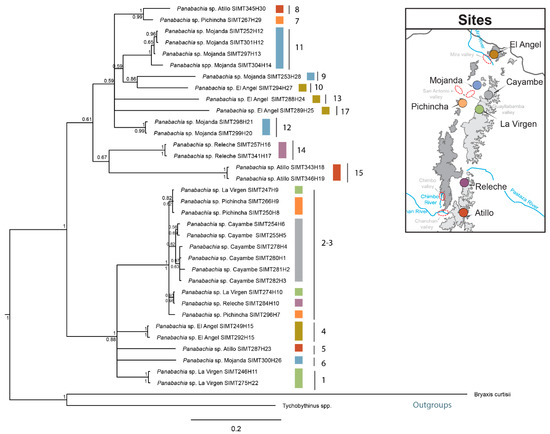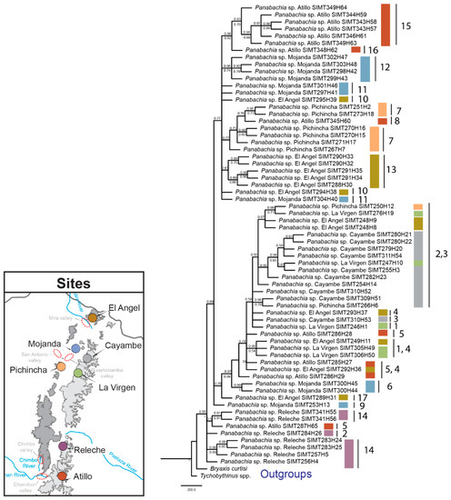 The main factors that affect cladogenetic events are associated with geographical isolation or ecological shifts [62]. Although most of the genetic clusters of Panabachia are well supported by bootstrap and posterior probability values, and represent distinct geographical areas, few phylogenetic relationships between clades are adequately supported to connect to geological events or features. Some correspondence with geography was found in the COI gene tree (Figure 5). For example, the split between species 8 and 7 spans opposite sides of the mountain range (Atillo and Pichincha). However, most of the speciation events with well supported branches show divergence between presumed species on the same sides of the mountain ranges but separated by distance (clades 9–10 and 14–15). In some instances, for example between clade 9 and 10, the distance might be reinforced by the presence of a putative barrier (Mira river and valley).