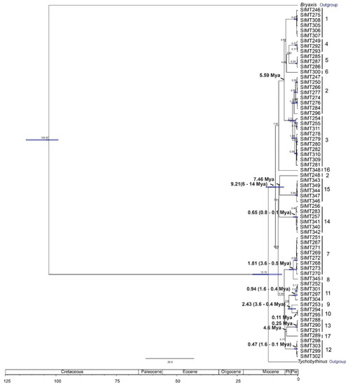 Divergence time estimates suggest that Panabachia in Ecuadorean páramo originated in the Miocene (9.2 Mya, Figure 7), and that most of the proposed species diverged during the Pliocene and Pleistocene (5.3–0.11 Mya). Two parallel radiations are observed through phylogenetic analyses; these radiations started in the Miocene (8–7.85 Mya) and continued throughout the Pleistocene. The first radiation event (7.86–0.47 Mya) gave rise to clade 7–17, and its sister gave rise to clade 1–6 (4.65–0.24 Mya). This second radiation is composed mostly of northern groups (clades 1–4, and 6), with the exception of clade 5, represented by specimens collected in Atillo (SE). Clade 2 was also exceptional, in that it contained individuals from several sites (La Virgen, Pichincha, El Angel and Releche), the last of which is quite remote from the others.