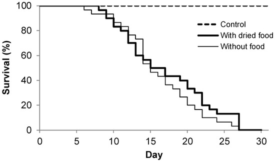 We found no significant differences in the initial larvae mass of the control variant compared to the larvae subjected to both simulated starvation treatments (F2.87 = 0.3681; p = 0.6931), where the control larvae had a mass of 0.257 (±0.012) g, the larvae fed dried food had a mass of 0.258 (±0.013) g, and the starved larvae had a mass of 0.254 (±0.012) g. In Experiment II, we checked whether access to dry food contributed to life extension of larvae using L3 larvae as a model (Figure 2). The log-rank survival test showed that there were no significant differences in survival between the larvae fed dried food and those with no food (starved). The maximum lifespan for both variants was 28 days. Similarly, half-level mortality of the larvae was observed at 16 days for both variants. After a period of experimentation (i.e., 28 days), the control larvae, i.e., those fed ad libitum, all survived (Figure 2).
