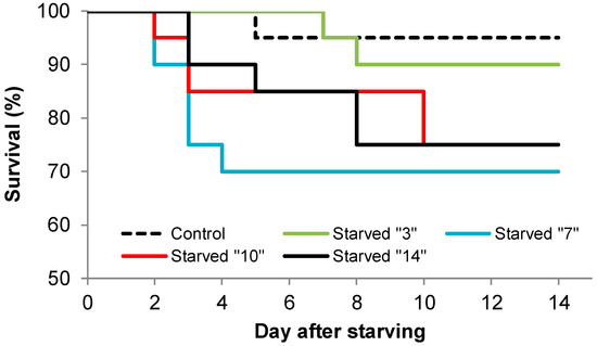 In this experiment, we also observed no significant differences in the initial larval masses between all treatments (F4.95 = 1.0887; p = 0.3666), where the control larvae had a mass of 0.253 (±0.019) g, the larvae starved for 3 days had a mass of 0.273 (±0.017) g, those starved for 7 days had a mass of 0.289 (±0.014) g, those starved for 10 days had a mass of 0.252 (±0.019) g, and those starved for 14 days had a mass of 0.255 (±0.015) g. Only surviving larvae were taken to observe the recovery phenomenon (see Section 2.2.3). Survival during the periods in which the larvae were subjected to starvation is not shown in Figure 3 but can be roughly read from Figure 1. In Experiment III, where we determined whether larvae that were starved for various durations could recover, we established that, in each of the treatments, some of the larvae survived the next 14 days until they again received ad libitum feeding (Figure 3). Almost all (95%) of the control larvae fed ad libitum survived throughout the period of the experiment (i.e., 14 days). The log-rank survival test showed that there were no significant differences in survival between the control larvae and the rest of the treatments. The highest levels of survivability (except controls) were characterized by the larvae subjected to simulated starvation for just three days. Calculations showed that larvae that were starved for 3 days, then fed and nevertheless died, had an average mortality time of 7.5 ± 0.5 days, larvae that were starved for 7 days had an average mortality time of 2.8 ± 0.3 days, larvae with the 10-day treatment had an average mortality time of 5.6 ± 1.8 days, and those with treatment for 14 days had an average mortality time of 5.4 ± 1.1 days.