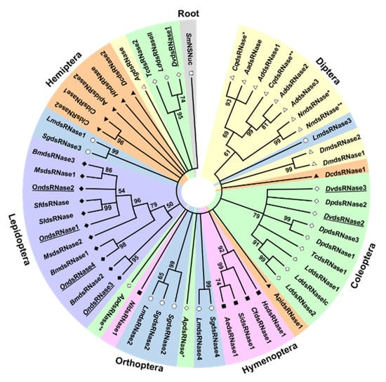 Phylogenetic tree showing the relationships between insect dsRNase proteins and bacterial nonspecific nuclease. Bootstrap support is indicated at internal nodes. Different shapes and shading denote different insect orders. The species and gene accession numbers corresponding to each sequence label are as follows for each order. Asterisks (*, **) differentiate unnumbered dsRNases from the same species. Diptera: AadsRNase, Aedes aegypti (EAT42072); CqdsRNase*, Culex quinquefasciatus (EDS34867.1); AddsRNase1, Anopheles darling (ETN62076.1); CqdsRNase**, C. quinquefasciatus (EDS38458.1); AddsRNase2, A. darling (ETN61460.1); AddsRNase3, A. darling (ETN61459.1); NndsRNase*, Nyssomyia neivai (JAV11177.1); NndsRNase**, N. neivai (JAV11176.1); DmdsRNase1, Drosophila melanogaster (AAF49206.1). DmdsRNase2, D. melanogaster (AAF49208.1); AgdsRNase, Anopheles gambiae (XP_320813.4). Coleoptera: DvdsRNase2, Diabrotica virgifera virgifera (MT653319); DvdsRNase3, D. v. virgifera (MT653320); DpdsRNase2, Dendroctonus ponderosae (ERL84039.1); TcdsRNase1, Tribolium castaneum (XP_970494.1); DpdsRNase3, D. ponderosae (AEE63490.1); DpdsRNase1, D. ponderosae (ENN82866.1); LddsRNase1/Ib, Leptinotarsa decemlineata (APF31792.1); LddsRNase2/Ia, L. decemlineata (APF31793.1); LdsRNaseIc, L. decemlineata (Swevers et al., 2013); ApdsRNase*, Agrilus planipennis (XP_018334885.1); ApdsRNase**, A. planipennis (XP_018323185.1); TcdsRNase2, T. castaneum (XP_015840884.1); DvdsRNase1, D. v. virgifera (MT653318); LddsRNaseII, L. decemlineata (Swevers et al., 2013). Hymenoptera: NldsRNase1, Neodiprion lecontei (XP_015515106.1); AedsRNase1, Acromyrmex echinatior (XP_011064189.1); SidsRNase1, Solenopsis invicta (XP_011156845.1); CfdsRNase1, Camponotus floridanus (XP_011263277.1); HsdsRNase1, Harpegnathos saltator (XP_011148137.2). Orthoptera: LmdsRNase3, Locusta migratoria (KY386893); SgdsRNase2, Schistocerca gregaria (AHN55089.1/APF31794.1); LmdsRNase2, L. migratoria (ARW74135.1); SgdsRNase1, S. gregaria (AHN55088.1); SgdsRNase4, S. gregaria (AHN55091.1); LmdsRNase4, L. migratoria (KY386894); SgdsRNase3, S. gregaria (AHN55090.1); LmdsRNase1, L. migratoria (ARW74134.1). Lepidoptera: BmdsRNase2, Bombyx mori (NP_001091744.1); OndsRNase1, Ostrinia nubilalis (MT524713); OndsRNase4, O. nubilalis (MT524714); BmdsRNase1, B. mori (XP_004922835.1); OndsRNase1, O. nubilalis (MT524715); OndsRNase2, O. nubilalis (MT524712); SldsRNase, Spodoptera litura (CAR92522.1); SfdsRNase, Spodoptera frugiperda (CAR92521.1); MsdsRNase2, M. sexta (Msex2.04564); BmdsRNase3/AlkNuc, B. mori (BAF33251.1); MsdsRNase1, M. sexta (Msex2.04563). Hemiptera: DcdsRNase1, Diaphorina citri (XP_017297751.1); ApidsRNase1, A. pisum (XP_003242652.1); CldsRNase1, Cimex lectularius (XP_014241898.1); CldsRNase2, C. lectularius (XP_014241376.1); HhdsRNase, Halyomorpha halys (XP_014282547.1); DcdsRNase2, D. citri (XP_008483858.1); ApidsRNase2, Acyrthosiphon pisum (XP_003248225.1). Root: Enterobacteriales: SmNSNuc, Serratia marcescens (AAA26560.1).