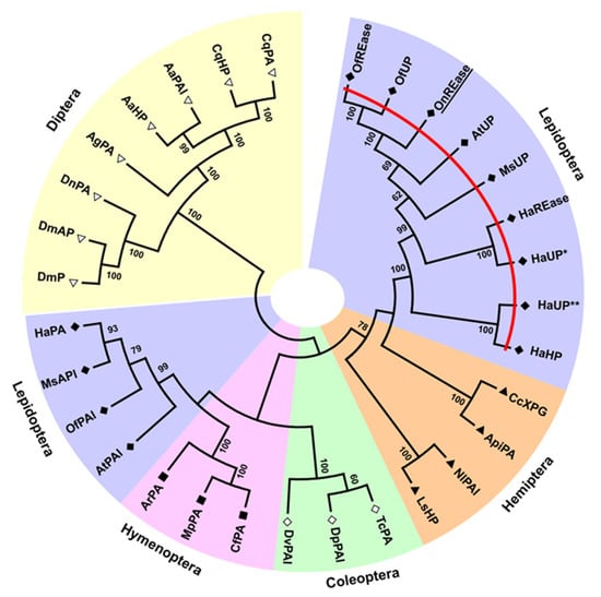 Phylogenetic tree showing the relationships between REase proteins (red line), protein asteroids, and unknown/hypothetical proteins from insects. Bootstrap support is indicated at internal nodes. Different shapes and shading denote different insect orders. The species and gene accession number corresponding to each sequence label is as follows for each order. Asterisks (*,**) differentiate unnumbered proteins from the same species. Lepidoptera: OfREase, Ostrinia furnacalis (XP_028162616.1); OfUP, O. furnacalis (XP_028162616.1); OnREase, Ostrinia nubialis (MT524716); AtUP, Amyelois transitella (XP_013194003.1); MsUP, Manduca sexta (XP_030022308.1); HaREase, Helicoverpa armigera (XP_021192733.1); HaUP*, H. armigera (XP_021192733.1); HaUP**, H. armigera (XP_021195627.1); HaHP, H. armigera (PZC74001.1); AtPAI, A. transitella (XP_013200440.1); OfPAI, O. furnacalis (XP_028160864.1), MsPAI, M. sexta (XP_030035285.1); HaPA, H. armigera (XP_021187181.1). Hemiptera: CcXPG, Cinara cedri (VVC40419.1); ApiPA, Acyrthosiphon pisum (XP_008180179.1); NlPAl, Nilaparvata lugens (XP_022192084.1); LsHP, Laodelphax striatellus (RZF34787.1). Coleoptera: TcPA, Tribolium castaneum (XP_975212.1); DpPAl, Dendroctonus ponderosae (XP_019754476.1); DvPAl, Diabrotica virgifera virgifera (XP_028153404.1). Hymentoptera: CfPA, Camponotus floridanus (XP_011264114.1); MpPA, Monomorium pharaonis (XP_012539364.1); ArPA, Athalia rosae (XP_012251909.1). Diptera: DmP, Drosophila melanogaster (AAK93494.1); DmAP, D. melanogaster (NP_523451.2); DnPA, Drosophila navojoa (XP_030240503.1); AgPA, Anopheles gambiae (XP_318635.3); AaHP, Aedes albopictus (KXJ83147.1); AaPAl, A. albopictus (XP_019538095.2); CqHP, Culex quinquefasciatus (XP_001870537.1); CqPA, C. quinquefasciatus (XP_001846107.1). No blast hits were found for Orthoptera. Abbreviations: RNAi-efficiency related nuclease, REase; uncharacterized protein, UP; hypothetical protein, HP; XPG N-terminal PIN domain-like endonuclease, XPG; protein asteroid, PA; protein asteroid-like, PAl.