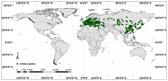 Worldwide geographic distribution records of A. custos.