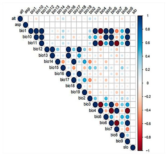 Variable selection is a crucial step for species distribution modeling. Both large and small subsets of environmental layers can greatly impact the performance of the models [55]. Model built with high multi-collinear variables is easily over-fitting [56]. Hence, in the current study, three methods (principal components analysis, Pearson correlation analysis, and the jackknife analysis) were combined to select the environmental variables with low correlation but high significance. Principal components analysis (PCA) and Pearson correlation analysis, as the main correlation-reducing techniques, are both widely used in the process of variable selection [57,58]. First, five principal components (PC1-PC5) were selected by PCA performed in R package “kuenm”, which explained almost 86% of variation in environmental variables. The three variables with highest correlation coefficient were selected from the five principal components as principal variables (Table S3-1, Table S3-2). Next, correlation analysis was performed using the R package “ellipsenm” and retained only one variable from each pair of highly correlated variables (│r│ ≥ 0.8), based on the percent contribution of each variable in the initial model by jackknife analysis in MaxEnt (Figure 2, Figure S1 and Table S4). Then, combining the result of PCA, six variables with low correlation but high importance (bio1, bio12, bio15, bio16, bio17, alt) were screened.