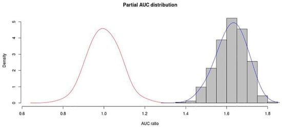 In the present study, the mean value for pAUC (at E = 0.05) was 0.811777 (mean AUC: 0.891), which represented good credibility for the model. Moreover, the distribution of the AUC ratio calculated as AUCpartial/AUCrandom was significantly greater than the random AUC ratio (p < 0.001), which shows high performance of the model (Figure 3).