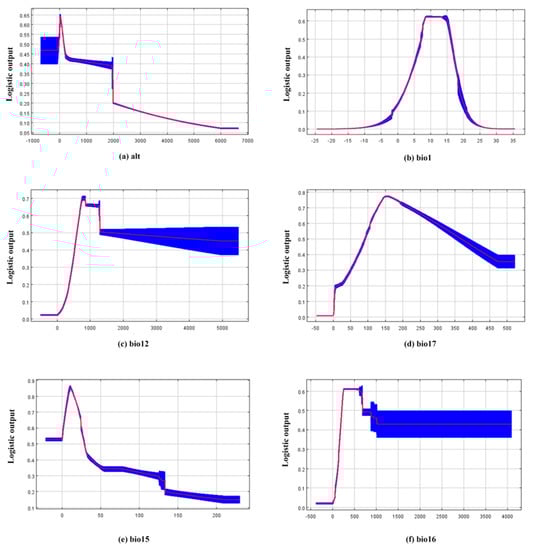 Response curves reflecting the relationship between the potential distribution of A. custos and environmental variables. The curves show the mean response of the 10 replicate MaxEnt runs (red) and the mean±SD (blue). (a) Altitude; (b) The annual mean temperature; (c) The annual mean precipitation; (d) Precipitation seasonality; (e) Precipitation of wettest quarter; (f) Precipitation of driest quarter.