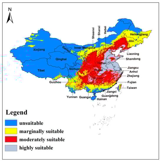 In the process of MaxEnt outputting, the convergence threshold and the maximum number of iterations were set to 10−5 and 500, respectively. Ten-fold cross-validation was used to execute MaxEnt for preventing random errors from the predicted samples, which were randomly partitioned into ten equivalent subsets, in which one was for model testing, and nine for model training. The logistic format was set to illustrate the results of MaxEnt. The binary suitable/non-suitable habitats were defined by a 10th percentile training presence logistic threshold, which has been widely applied to species distribution modeling, especially when data were collected by different collectors [63]. We adopted the median of all the bootstrapped replicates to better present the geographic predictions of final models [64]. The distribution maps were classified into four levels: <threshold, unsuitable; threshold–0.4, marginally suitable; 0.4–0.6, moderately suitable; and 0.6–1, highly suitable.