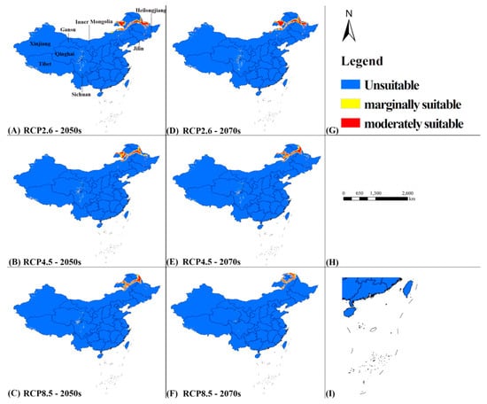The potential distribution of A. custos under future scenarios in China. Pictures from (A–F) represent the potential distribution of A. custos in the 2050s and 2070s under three climate scenarios; (G) The legend; (H) Scale bar; (I) South China Islands.