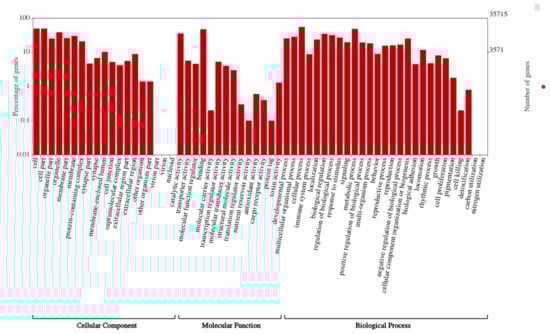 After the assembly, the unigenes were searched against the Swiss-Prot, and GO databases and annotated. A total of 33,932 (95%) unigenes were annotated by the blastx search against the Swiss-Prot database. The species distribution of the top-hit BLAST against the Swiss-Prot database revealed two closely matched species viz., A. glabripennis and D. melanogaster (Figure 1). The gene function prediction by GO analysis resulted in 26,492 annotated genes distributed in three major categories, biological process, cellular component, and molecular function (Figure 2). All three categories biological process (22,812), cellular component (21,648), and molecular function (22,970) represented similar number of functional groups. Furthermore, DEG was analyzed to find differences in the expression pattern between immunized and non-immunized P. hilaris. The immunization mixture of Gram positive, Gram negative and fungus might potentiate defense pathway activation. A cutoff of log2FC ≥ 2 and a p-value < 0.05 was set and a total of 2381 transcripts were obtained to be differentially expressed. Among these, 1206 transcripts were upregulated while 1175 transcripts were downregulated in the immunized group when compared with the control.
