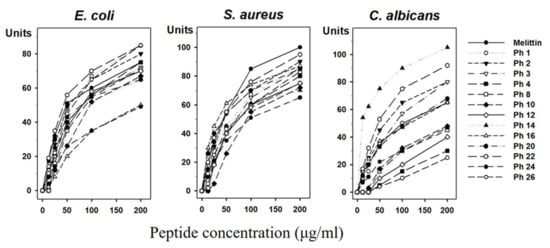 Figure 3. Antimicrobial activity assay. Antimicrobial activities of 13 selected peptides against E. coli, S. aureus, and C. albicans determined by a radial diffusion assay. Peptide concentration (x-axis) was plotted against the diameter of the microbial growth inhibition zone (y-axis) after incubation for 12 h and is expressed in units (1 mm = 10 units). Melittin was used as a positive control. Mean values were obtained from tests repeated three times.