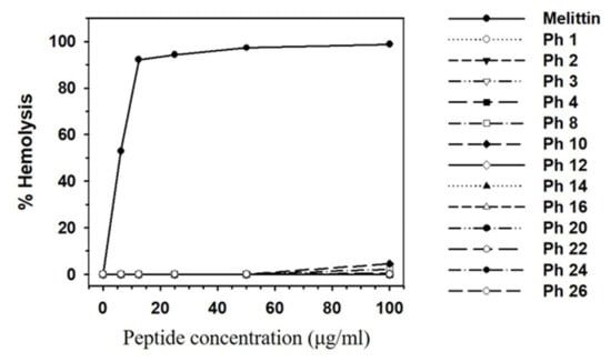 Figure 4. Cytotoxic effects of 13 selected peptides. Hemolytic activity of the peptides. Peptide concentration (x-axis) is plotted against the percentage of hemolysis (y-axis) of mouse red blood cells after incubation for 30 min. Melittin was used as the positive control. The percent hemolysis was calculated with the following equation: hemolysis (%) = (A540 of samp—A540 of peptide-free control)/(A540 of 100% control—A540 of peptide-free control) × 100. Each symbol represents the mean value estimated from triplicate experiments.