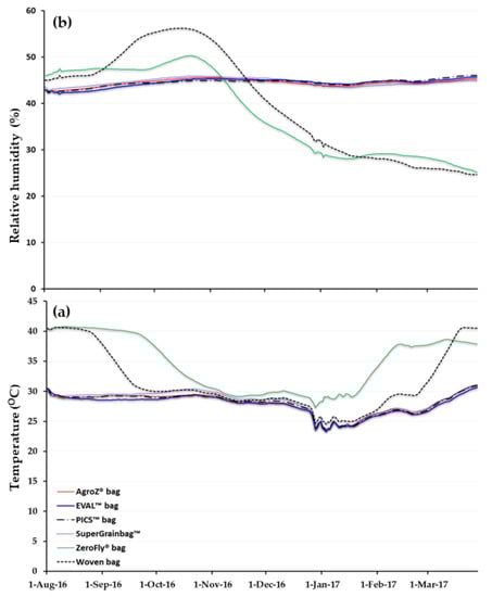 (a) daily average temperatures and (b) relative humidities in six types of hermetic and non-hermetic bags filled with naturally-infested cowpea stored for eight months in Maradi, Niger.
