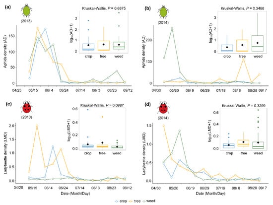Population dynamics of aphids and ladybeetles on different plant functional groupsatthe field scale in 2013 and 2014. Aphid density (AD) in 2013 (a) and 2014 (b) and ladybeetle metapopulation density (LMD) in 2013 (c) and 2014 (d) are the mean values on each sampling date in three plant functional groups. Boxplots nested in the top right corner are the mean values of AD and LMD throughout the whole sampling period. Diamond points with black color in the box are the mean value for each functional plant taxon, whereas the line in each box is the median, and box edges represent the lower (Q1) and upper (Q3) quartiles. The number of plant species of plant functional groups (crops, trees, weeds) was 21, 8, and 49 species in 2013 and 26, 8, and 46 species in 2014, respectively. The p value indicated no significant difference (p > 0.05) between these plant taxa within the Kruskal–Wallis test.