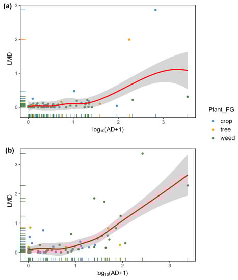 For the GLMMs, no significant impacts were found for the interaction of aphid density (AD) and the three plant functional groups (Plant_FG) in 2013 (LRT chi-square test = 1.68, df = 2, p = 0.432) or 2014 (LRT chi-square test = 1.47, df = 2, p = 0.480) (AD: Plant_FG in Table S2, Figure S3a,b). However, the LMD wassignificantly positively related to AD across all plants in both years (2013: Wald Z = 4.14, p < 0.001, Figure 2a; 2014: Z = 5.62, p < 0.001, Figure 2b). These results indicated that aphid density was the main determinant of aphidophagouspredatory ladybeetle abundances at the local field scale.