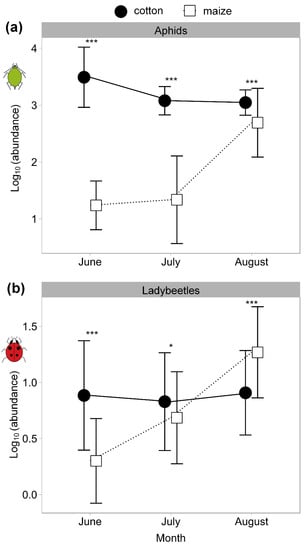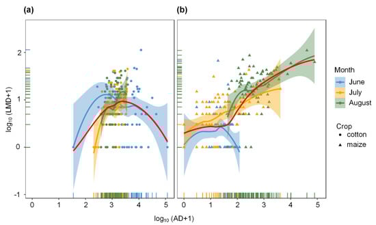 Furthermore, the GLMM analysis also revealed the relationship between the occurrence of ladybeetles and aphids at the regional landscape scale (Table 1). LMD was significantly positively related to AD (Wald Z = 3.93, p < 0.001), and the interactions such as AD:crop (LRT chi-square test = 100.18, df = 1, p < 0.001) and AD:month (LRT chi-square test = 223.38, df = 2, p < 0.001) were both significant, which indicated the positive effects of AD on LMD were also significant between different crops and different sampling periods. For individual crop, the positive effect of the AD on LMD was only significant on maize (Z = 91.37, p < 0.001, AD:crop-maize interaction) rather than cotton among different sampling periods (from June to August) (Figure 4). The positive relationship between LMD and AD was also significant in July (Z = 6.01, p < 0.001, AD:month-July interaction) and August (Z = −87.56, p < 0.001, AD:month-August interaction) on both cotton (Figure 4a) and maize (Figure 4b).