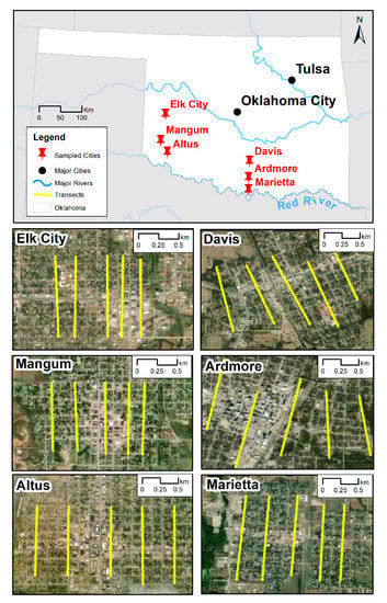 Any successful control strategy begins by documenting where competent vector species reside and evaluates how mosquito communities differ among sites [9,16,17]. Given the critical lack of knowledge regarding the habitats in which container-breeding mosquitoes thrive in southern Oklahoma, the aim of the study was to create a baseline from which to study the ecology of container-breeding mosquitoes in small cities in the southern Great Plains. The objectives were to (1) determine the distribution of Aedes aegypti and Aedes albopictus in urban zones of different cities, and (2) identify landscape and anthropogenic variables related to their presence and abundance in central and western Oklahoma.