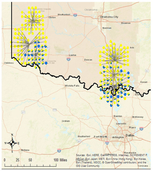 Between June and August 2017, 242 commercial or residential sampling sites were sampled in six cities along two regional bi-weekly transects in southern Oklahoma (Figure 1). A total of 6628 female mosquitoes were collected over 210 trap-nights/week producing a total of 900 trap deployments involving 2100 trap-nights during the summer of 2017 (Table 2).