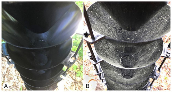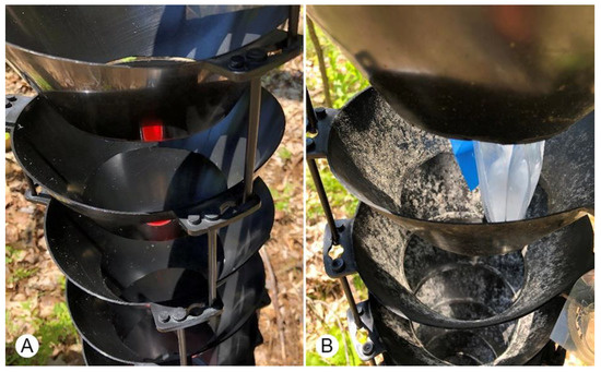 Example of multiple-funnel trap treatments from Experiment 1 in a mixed conifer stand in southeastern New Hampshire. (A) Clean trap without surfactant switched out biweekly with a clean trap; (B) Control trap without surfactant after six weeks in the field (not shown: two additional treatments of surfactant-treated clean trap and surfactant-treated control trap).