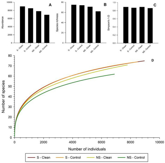 Abundance and diversity metrics for beetles captured in clean vs. control multiple-funnel traps with (S) and without surfactant (NS) treatment during Experiment 1 in southeastern New Hampshire. (A) Abundance of bark and woodboring beetles; (B) Species richness; (C) Simpson’s 1-D estimates; (D) Individual-based rarefaction curves.