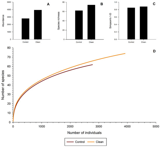 Total abundance, species richness, and species diversity were higher in cleaned than control traps (Figure 4A–C). Average species richness was similar between control and clean traps (F1,6 = 4.4, p = 0.08; Table 2). Chao-1 estimates suggested that more species were available to sample, with estimates of 76 and 91 species for control and cleaned traps, respectively. Rarefaction also suggested that cleaned traps captured more species than control traps (Figure 4D).