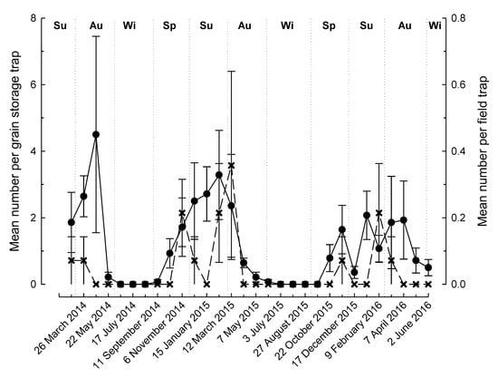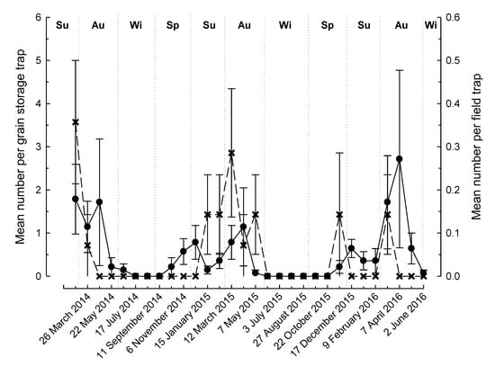 - Wright, E.J.; Morton, R. Daily flight activity of Trogoderma variabile (Coleoptera: Dermestidae) and Rhyzopertha dominica (Coleoptera: Bostrichidae). J. Stored Prod. Res. 1995, 31, 177–184. [Google Scholar] [CrossRef]