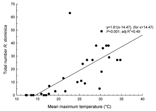 - Edde, P.A.; Phillips, T.W.; Nansen, C.; Payton, M.E. Flight activity of the lesser grain borer, Rhyzopertha dominica F. (Coleoptera: Bostrichidae), in relation to weather. Environ. Ecol. 2006, 35, 616–624. [Google Scholar] [CrossRef]