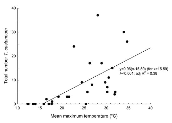 - Borgmeister, C.; Meikle, W.G.; Scholz, D.; Adda, C.; Degbey, P.; Markham, R.H. Seasonal and weather factors influencing the annual flight cycle of Prostephanus truncatus (Coleoptera: Bostrichidae) and its predator Teretriosoma nigrescens (Coleoptera: Histeridae) in Benin. Bull. Entomol. Res. 1997, 87, 239–246. [Google Scholar] [CrossRef]