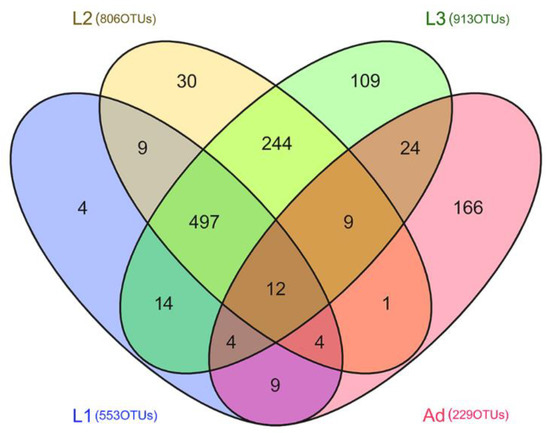In this study, a total of 1,997,394 quality–filtered bacterial sequences were retrieved from the 54 samples for the primer pair F515/R907, ranging from 26,163 to 61,214 sequences per sample (Table S2). A total of 1136 bacterial OTUs were detected (relative abundance (%) <0.01%), with all samples ranging from 200 to 5912 (97% similarity), and 12 OTUs were shared across all life stages. There were 553, 806, 913 and 229 OTUs in L1, 1st instar; L2, 2nd instar; L3, 3rd instar and Ad, Adults, respectively. In addition, there were unique OTUs within each stages, especially for adults, where the unique OTUs accounted for 72.4% with the 229 distinct OTUs observed, and the unique OTUs of 1st instar, 2nd instar, 3rd instar accounted for 0.7%, 3.7% and 11.9%, separately (Figure 1).