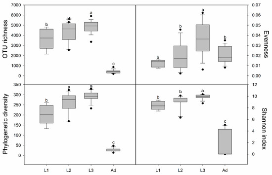 Intestinal bacterial alpha-diversity in different developmental stages. The bottom and top of the box denote the first and third quartiles respectively; the band inside the box denotes median; error bars denote standard deviations; different letters above bars represent significant differences from Tukey’s HSD comparisons (p < 0.05). L1, 1st instar; L2, 2nd instar; L3, 3rd instar; Ad, Adults.