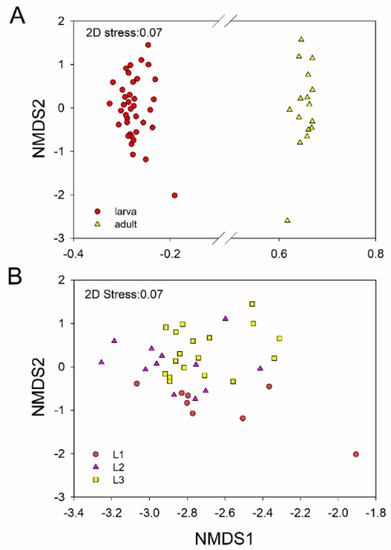 Non-metric multidimensional scaling (NMDS) plot showing bacterial community composition between larvae and adults (A), and contrasts between different larval instars (B). L1, 1st instar; L2, 2nd instar; L3, 3rd instar; Ad, Adults.