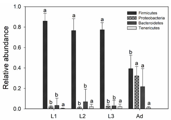 Relative abundance of bacterial taxa at phylum in the gut of different life stages of P. muelleri. Bars represent mean; error bars denote standard deviation, letters above bars represents significant differences from one-way ANOVA (p < 0.05). L1, 1st instar; L2, 2nd instar; L3, 3rd instar; Ad, Adults.