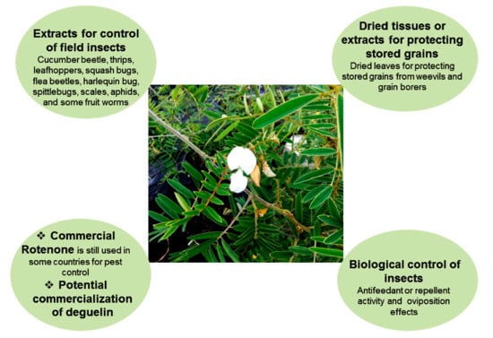 The discussed Tephrosia species are rich in bioactive compounds and show insecticidal activities against different insect pests. Based on the current information, the use of Tephrosia plants for insect pest management can be summarized as the follows (Figure 2).