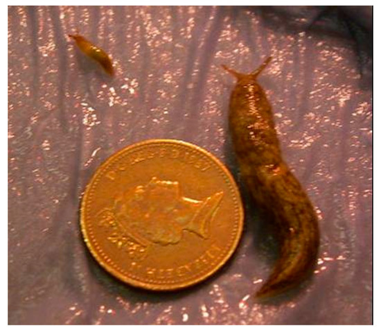 Growth variation in Deroceras reticulatum of the same chronological age (20 weeks). Slugs were reared under identical conditions. Both hatched in spring and were maintained at 15 °C. Scale is indicated by a 1 pence piece (diameter 20.3 mm).