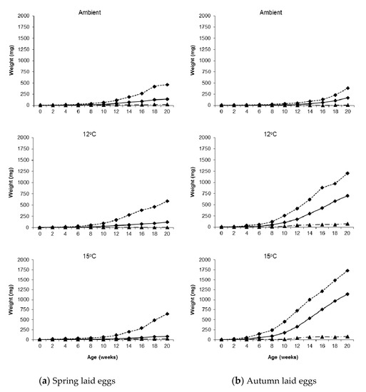 The potential of a slug population to attain pest proportions is largely determined by its initial size and the speed with which it can complete its lifecycle whilst favourable conditions prevail. It is well-established that temperature influences many aspects of the biology of terrestrial slugs, including growth rate [5,6,7]. For Deroceras reticulatum, most studies have shown that the relationship between growth rate and temperature is approximately hyperbolic; there is a positive association up to an optimum of 17–19 °C after which higher temperatures have a detrimental effect on development [8,9,10,11]. An exception to this are the works of Judge [12] and Clemente et al. [13] whose data indicate that growth is faster at cooler temperatures. All of these studies are based on slugs hatching at one particular point in time—i.e., a single season—although few actually state which season this is. D. reticulatum is capable of breeding throughout the year if conditions are favourable, but there are peaks in spring and autumn [14,15,16]. The autumn population has to over-winter, either as eggs or recently hatched juveniles, and it is postulated that there may be something inherently different in the physiology of these slugs compared to the spring population that adapts them for development and survival at lower seasonal temperatures. If so, it might be expected that the growth trajectories of spring and autumn hatching slugs will differ when reared under identical conditions. This may explain the discrepancy between the work of Judge [12], Clemente et al. [13] and other authors.