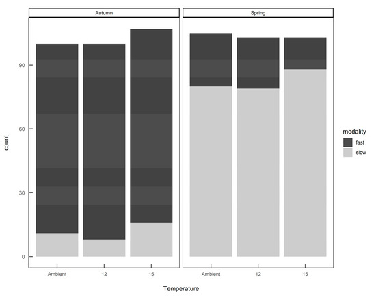 When the individual growth rates were plotted by hatching season and rearing temperature (Figure 5) it can be seen that slugs identified as belonging to the ”fast” modality that were hatched in spring still had a lower average growth rate than the same modality hatched in autumn, and rearing temperature had some effect on the distribution of growth rates within each modality. Eggs from the same egg batch developed into slugs of either or both modalities, in proportions representative of the season in which they were laid—there was no evidence that parents laid eggs all of one modality.