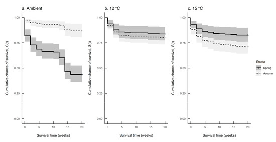 Survival predictions for Deroceras reticulatum reared at (a) ambient temperature, (b) 12 °C and (c) 15 °C in spring (solid line) and autumn (dashed line).