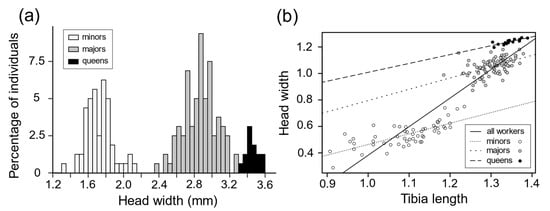 (a) Distribution of worker and female reproductive (queens) head width based on measurements from 157 workers (60 minors and 97 majors) originating from 4 colonies and from 15 female reproductive out of one colony. (b) Relationship between head width and tibia length based on measurements from 143 workers (55 minors and 88 majors) and 15 queens. The two variables were natural log-transformed. When the measurements for the two worker subcastes were combined (solid line), the regression analysis revealed the presence of allometry (linear regression: slope ± SE = 2.07 ± 0.07, F1,142 = 809.3, p = 0). In the worker subcaste-specific regressions, the slopes for the minors (line with short dashes) and the majors (line with long dashes) were not significantly different from 1, indicating that there was no further allometry within subcastes (minors: slope ± SE = 0.80 ± 0.10, t test, t = −1.94, df = 53, p = 0.057; majors: slope ± SE = 0.86 ± 0.16, t test, t = −0.89, df = 86, p = 0.38).
