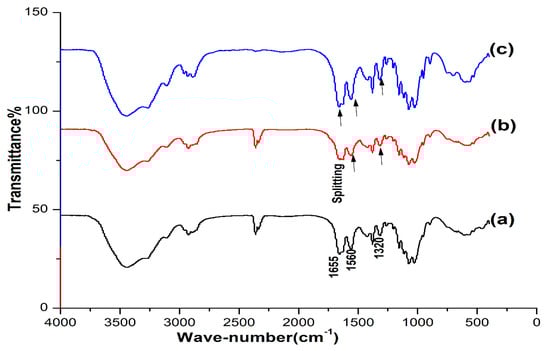 The IR spectra of OSPC were compared with those of commercial shrimp and crab chitins. Comparing the IR spectra revealed the great similarity between the OSPC, crab and shrimp chitins. The spectra of the three samples were characterized by three amide peaks at wave numbers ≈ 1655, 1560 and 1320 cm−1 corresponding to the amide Ι stretching of C=O, the amide ΙΙ of N-H and amide ΙΙΙ of C-N, respectively, with an observed splitting of the amide I into three samples at about 1655 and 1625 cm−1 (Figure 1).