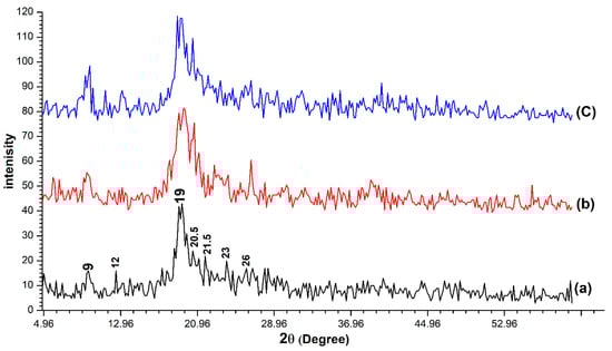 The XRD patterns matching for the three chitin samples determined a large similarity between them (Figure 2). The three samples were characterized by two strong peaks at about (2θ ≈ 9, 2θ ≈ 19) and five faint peaks at about (2θ ≈ 12, 2θ ≈ 20.5, 2θ ≈ 21.5, 2θ ≈ 23, 2θ ≈ 26). The crystallinity index (CrI) was calculated according to formula (2) to be 85.7%, 82.5% and 83.72% for OSPC, crab chitin and shrimp chitin respectively.