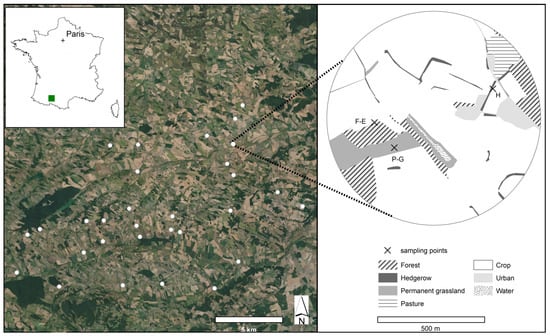 The study was conducted in the Vallées et Coteaux de Gascogne in south-western France (Figure 1), which is part of the Long-Term Socio-Ecological Research site ZA PYGAR (17′ N, 54′ E). This hilly region (250–400 m a.s.l.) is characterized by a mosaic of grasslands, small forests and crop fields (mainly winter cereals) [43]. The climate is sub-Atlantic with slight Mediterranean influences (mean annual temperature, 12.5 C; mean annual precipitation, 750 mm).