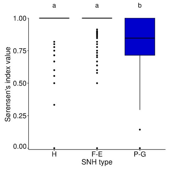 Boxplots of Sørensen’s index between sampling points of each type of SNH (H: hedgerows, F-E: forest edges and P-G: permanent grasslands). The letters above each plot indicate significant differences between types of SNH after multiple comparisons (Dunn’s test) following the KW test. Boxplots represent median value, first and third quartile.