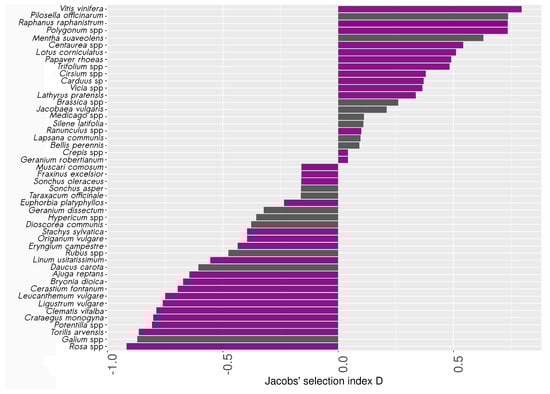 Selectivity of pollen sources by wild bees (Jacobs’ index D). An index > 0 indicates higher relative abundance of the pollen species on bees’ bodies compared to its availability in the botanical survey, whereas an index < 0 indicates negative selection of the species. Purple bars represent species with a significant positive or negative D, following the calculation of the confidence intervals (2.5 and 97.5%) with bootstrap resampling in pollen species, and grey otherwise. For this analysis, some pollen species have been switched at the genus level.
