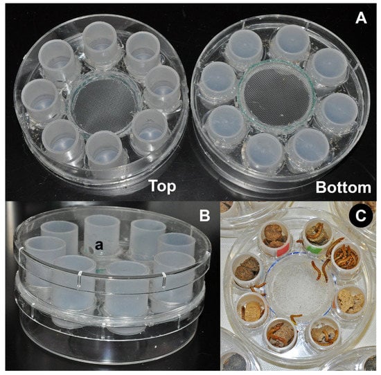 - Morales-Ramos, J.A.; Rojas, M.G.; Shapiro-Ilan, D.I.; Tedders, W.L. Self-selection of two diet components by Tenebrio molitor (Coleoptera: Tenebrionidae) larvae and its impact on fitness. Environ. Entomol. 2011, 40, 1285–1294. [Google Scholar] [CrossRef]