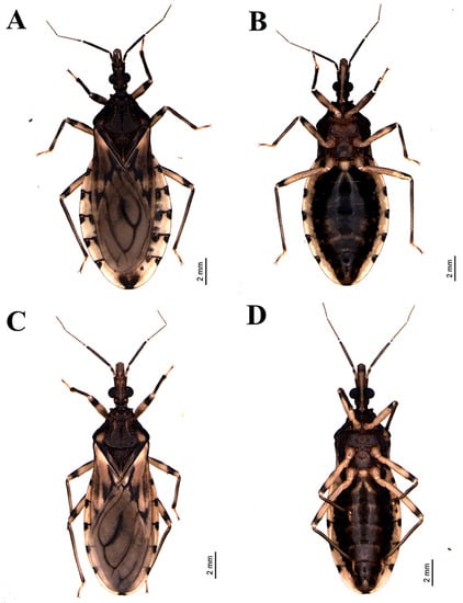 Currently, there are 154 species of triatomines described, grouped into 18 genera and five tribes []. Although there are species with a greater or lesser degree of importance in the transmission of Chagas disease, all triatomines, of both sexes and at any stage of development after hatching, are considered as potential vectors of this disease described more than 110 years ago [,].
