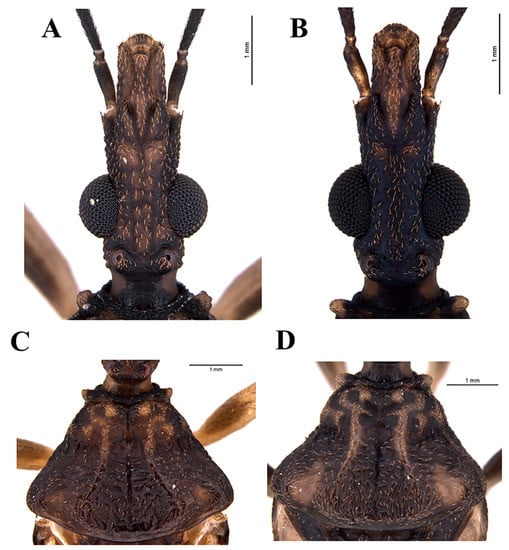 Detail of Head: (A) T. rosai sp. nov. dorsal view, (B) T. sordida dorsal view; detail of Pronotum: (C) T. rosai sp. nov. dorsal view, (D) T. sordida dorsal view.