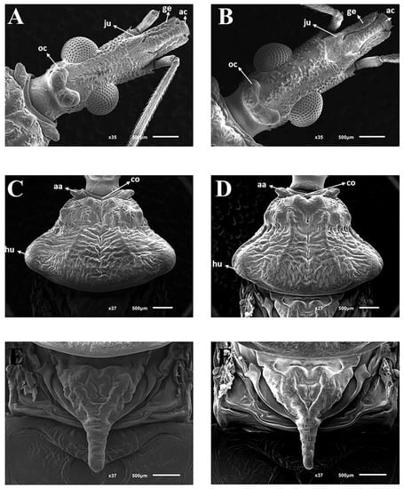 For the comparative morphological study, 2 males and 2 females of T. rosai sp. nov. and 2 males and 2 females of T. sordida (MG/Brazil) from Araraquara Triatominae Colony (CTA) were used. For morphological characterization of the triatomines in Scanning Electron Microscope (SEM) (according to Rosa et al. []), four individuals of each locality were used, emphasizing the study of the pronotum, scutellum, as well as female external genitalia. For this study, the insects were cleaned in ultrasonic devices, dehydrated in graded series of alcohol, oven-dried at 45 °C for 20 min, and then fixed in small aluminum cylinders with colorless enamel. Afterward, they were metalized by sputtering for two minutes with 10 mA of power. After the metallization process, the samples were analyzed and photographed on the Topcon SM-300 SEM (Digital, Hasunuma-cho, Tokyo, Japan).