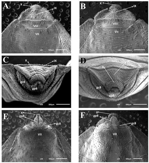 Posterior view of female external genitalia: the central part of the region that divides the eighth and ninth segments is straight; the junction of the ninth segment IX with the central portion is convex. Being elevated, the lateral portions (1 + 1) form depressions in the anteroposterior direction (Figure 5B). The boundaries between the ninth and tenth segments are opened on the sides and closed in the central area (Figure 5B). The tenth segment is semicircular (Figure 5B). Gonocoxites 8 are penniform, while gonapophyses 8 are almost triangular (Figure 5B).