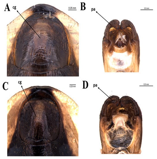 Detail of genital capsule T. rosai sp. nov.: (A) dorsal view, (B) ventral view, T. sordida: (C) dorsal view, (D) ventral view. cg: genital capsule, pa: paramere.