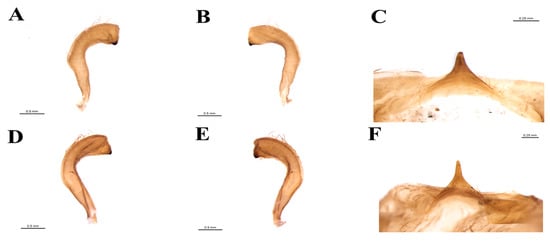 Paramere of T. rosai sp. nov.: (A) dorsal view, (B) ventral view; (C) median process of the pygophore; Paramere of T. sordida: (D) dorsal view, (E) ventral view; (F) median process of the pygophore.